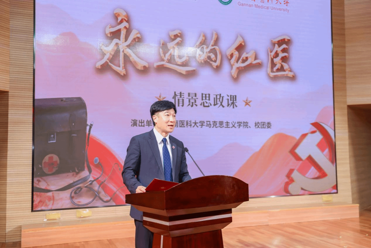 我校党委书记、校长张小康在致辞中对天津医科大学表示诚挚的感谢。他指出,天津医科大学秉承“德高医粹、求真至善”的精神,为我国医学事业培育了大批卓越人才,成就斐然。此次展演是红医精神与严谨治学理念的深度对话,更是共同探索新时代立德树人新路径的生动实践。他在致辞中强调了“红医精神”的核心内涵及其时代价值。他表示,作为扎根于红医精神发源地的高等医学学府,我校有责任将“政治坚定、技术优良、无私奉献、救死扶伤、艰苦奋斗、勇于开创”的红医精神传承好、发扬好。“永远的红医”情景思政课,正是我校依托中央苏区红色卫生史多年的研究成果,探索“师生同台、专题+艺术”沉浸式育人的创新实践。本次展演意在将这份来自红土地的信念与担当,传递至北方医学教育重镇,激发新时代医学青年的共鸣与思考,探寻红医精神密码,在心灵触动中坚定信仰追求。
